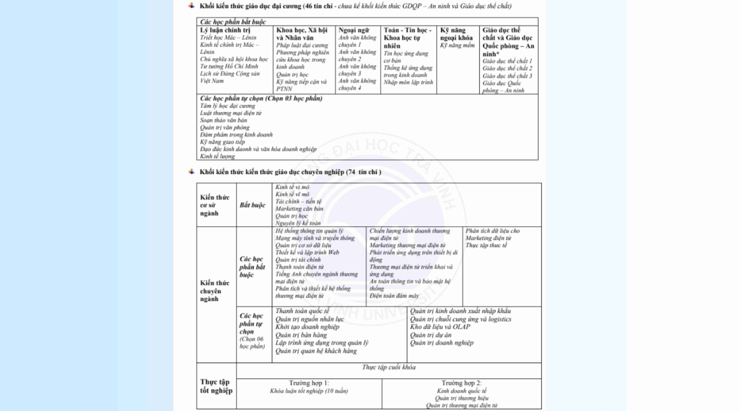 Ngành Thương mại điện tử tại trường Đại học Trà Vinh có mã ngành là: 7340122. Với tổ hợp môn xét tuyển bao gồm: A00 (Toán, Vật lí, Hóa học); A01 (Toán, Vật lí, Tiếng Anh); C14 (Toán, Ngữ Văn, GDCD) và C15 (Toán, Ngữ văn, Khoa học xã hội). Sinh viên sẽ hoàn thành thời gian học là 3,5 năm (bao gồm 7 học kỳ, 120 tín chỉ), trong đó thực tập Co-op tại Doanh nghiệp là 12 tháng và được miễn phí 24 tín chỉ học phần Co-op. Từ đó, sinh viên sẽ có được: